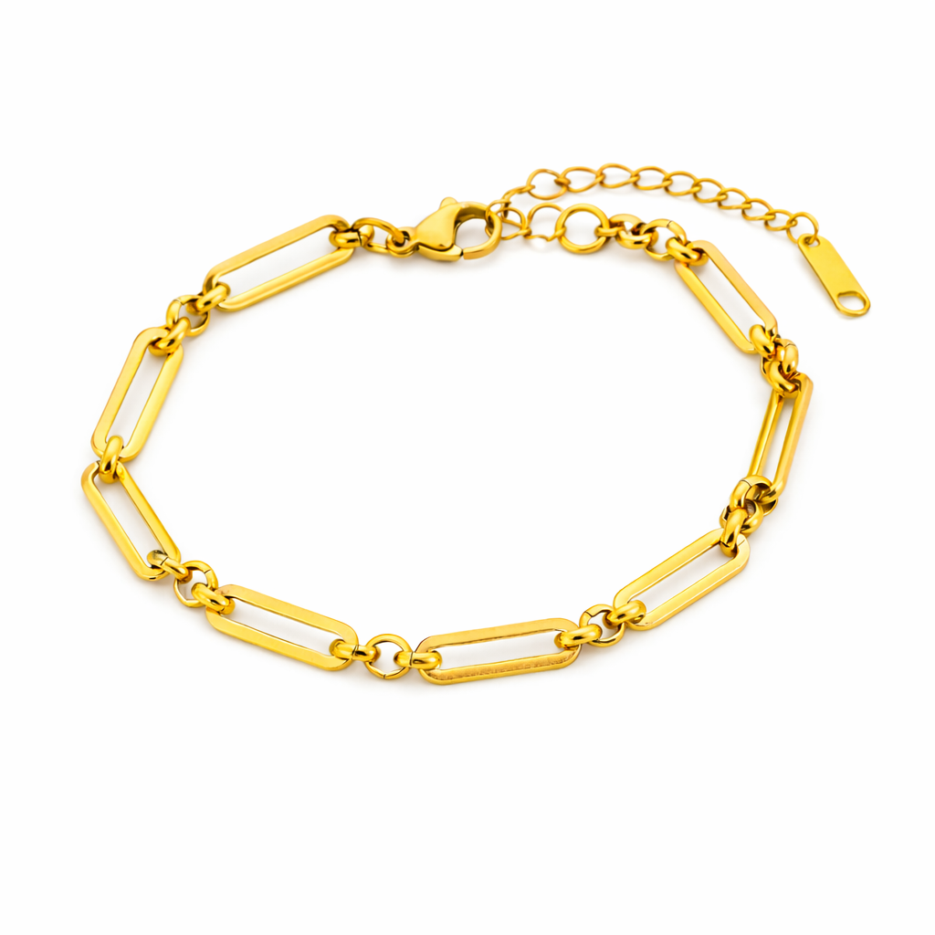 Il Bracciale Sidney è realizzato in acciaio placcato oro, questo materiale garantisce durata e resistenza, rendendolo ideale per essere indossato ogni giorno. Perfetto sia da solo che abbinato ad altri gioielli. 18+5cm