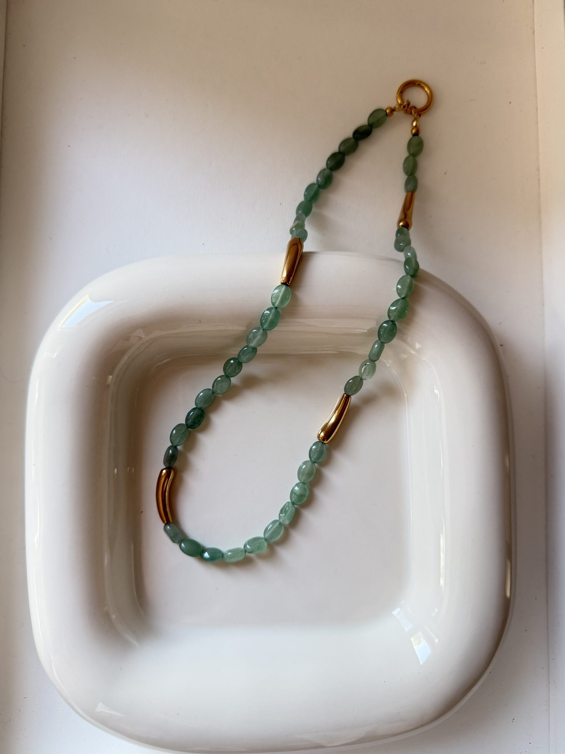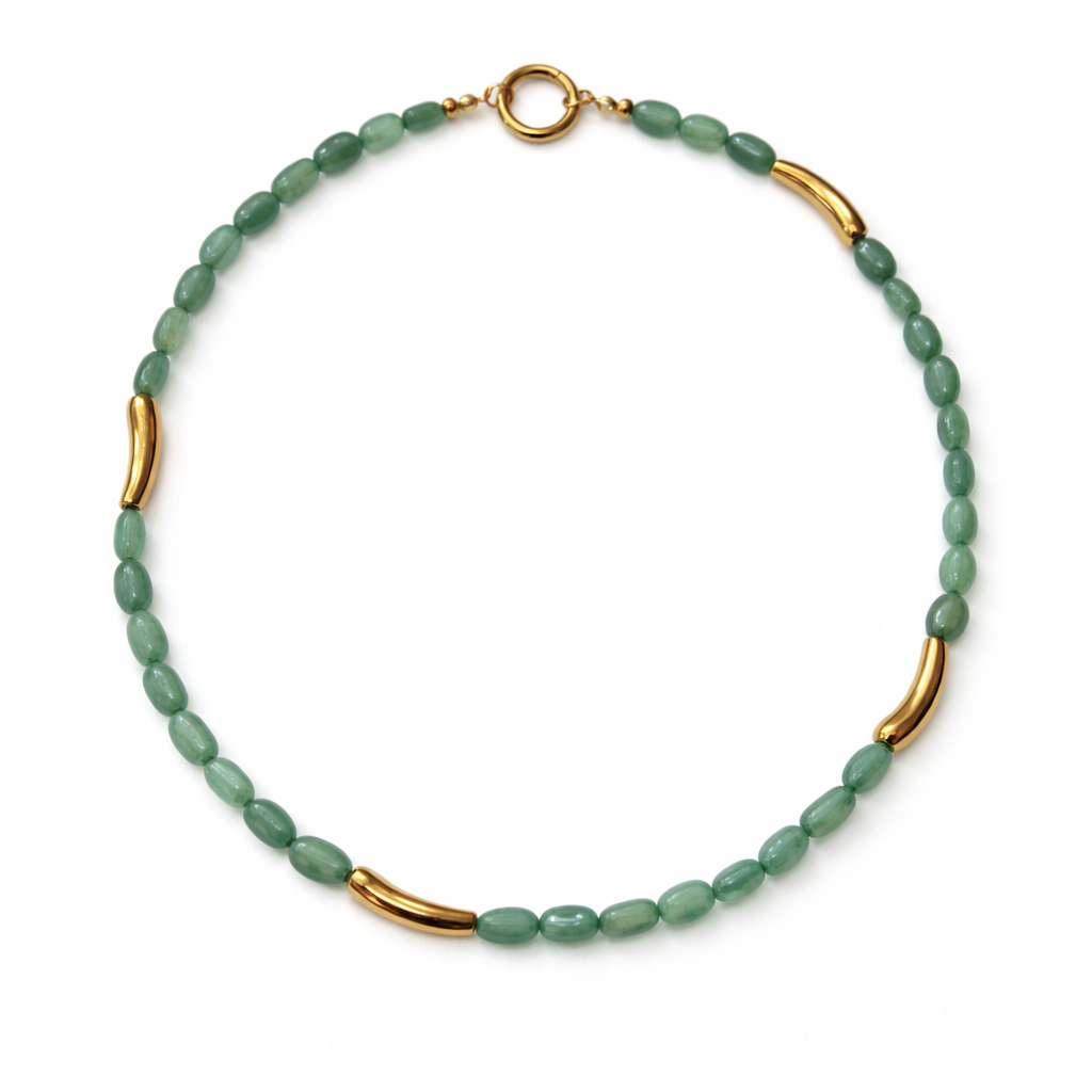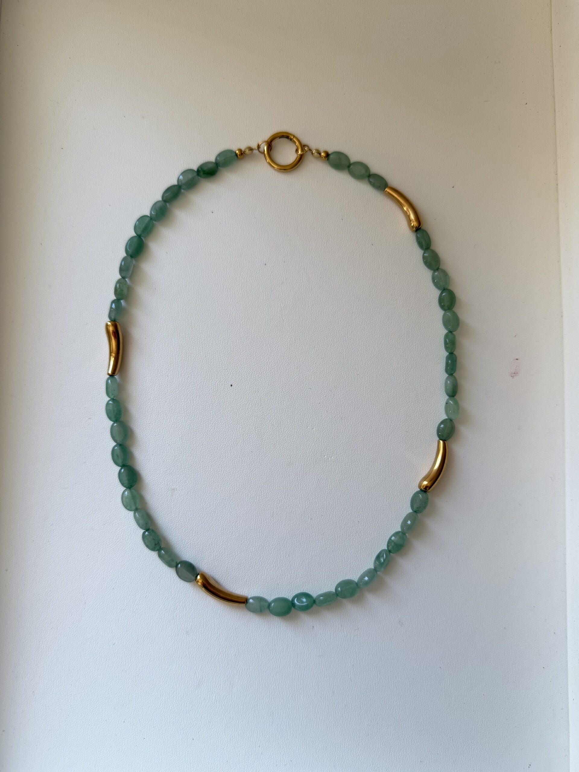 Collana realizzata con pietre naturali, che creano un effetto materico e autentico. Ogni pezzo è leggermente diverso dall’altro: le imperfezioni delle pietre raccontano la loro naturalezza e rendono la collana unica. Caratteristiche: Pietre naturali Avventurina Lunghezza: 45 cm Parte metallica in acciaio inossidabile. La chiusura rotonda è pensata anche come elemento funzionale: può essere utilizzata come gancio per aggiungere ciondoli. Questo rende la collana versatile e a doppio utilizzo: puoi indossarla in modo classico con la chiusura sul retro, oppure portarla davanti, trasformandola in un punto centrale decorativo a cui agganciare i tuoi ciondoli preferiti. Personalizzazione: Su richiesta è possibile modificare lunghezza e chiusura per adattarla perfettamente al tuo stile. Un accessorio leggero ma d’impatto, ideale da indossare da solo o abbinato ad altre collane per un effetto layering.
