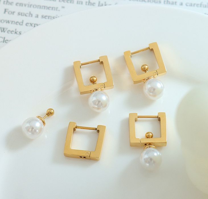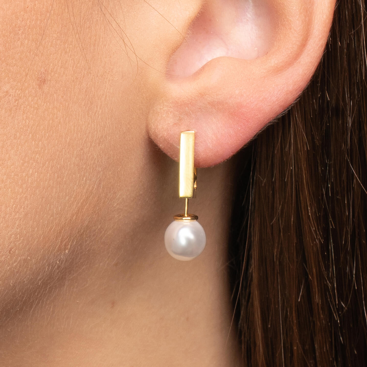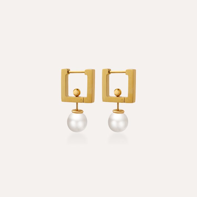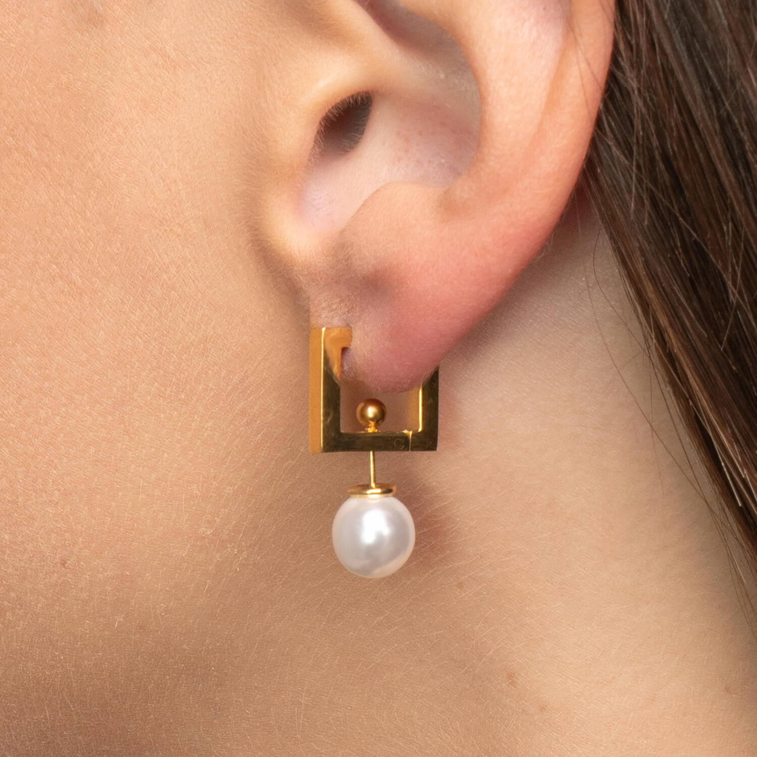 Orecchini Pendenti Quadrati con Perla in Acciaio Placcato Oro 18 Carati