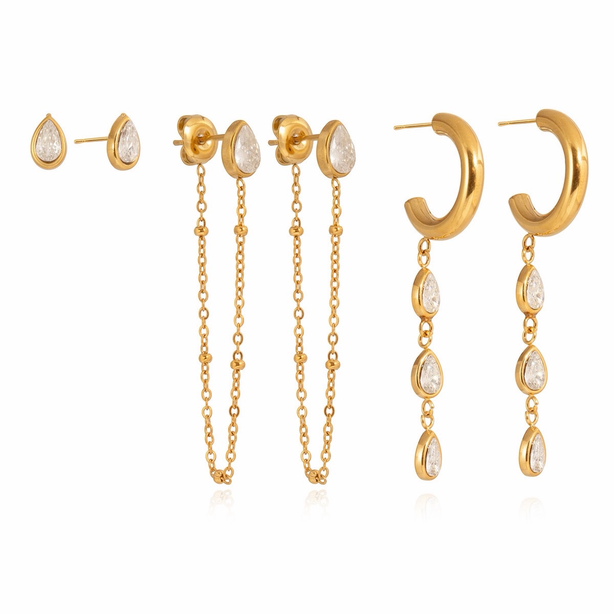 Un set pensato per adattarsi a ogni stile e momento. Tre paia di orecchini coordinati, da indossare insieme o separatamente, per creare combinazioni sempre diverse.